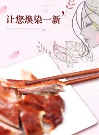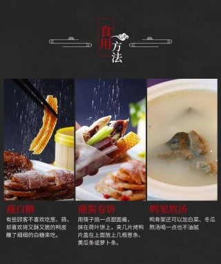 👉用筷子挑一点甜面酱,抹在荷叶饼上,放几片烤鸭盖在上面,再放上几根葱条、黄瓜条,将荷叶饼卷起,真是美味无比。